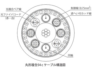 同軸ケーブル、光ファイバ、信号線、動力線をケーブルに一体化した移動用ケーブルです。