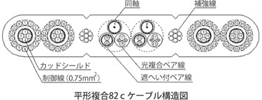 同軸ケーブル、光ファイバ、信号線、動力線をケーブルに一体化した移動用ケーブルです。